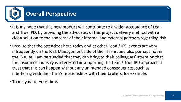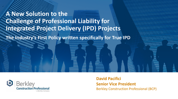 Join David Pacifici, Senior Vice President at Berkley Construction Professional, for an exclusive webinar revealing the industry's first insurance solution specifically crafted for True Integrated Project Delivery (IPD) projects.
